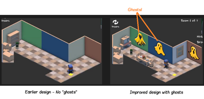 To fix that, we painted goofy ghost portraits on the walls, hinting that the ghosts themselves were responding.