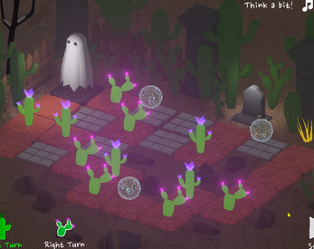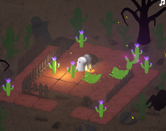 A weary Halloween ghost has lost its way in the desert and can only see cacti. Before sunrise, guide it back to its grave by planting cacti along the brick road to steer it to it’s grave.